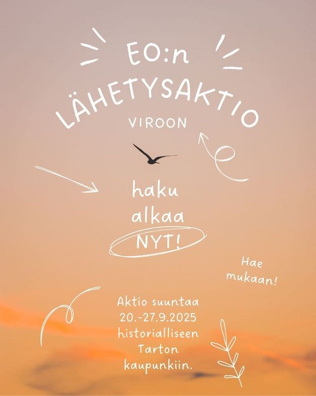 Armon vuonna 2025 EO:n ulkomaanaktio valloittaa Viron. Aikavälillä 20.–27.9.. on tiedossa tutustumista lähetystyöhön paikan päällä, omien lahjojen likoon laittamista, Jumalan työrukkasena olemista ja lähetyskäskyn todeksi elämistä etelänaapurissa.