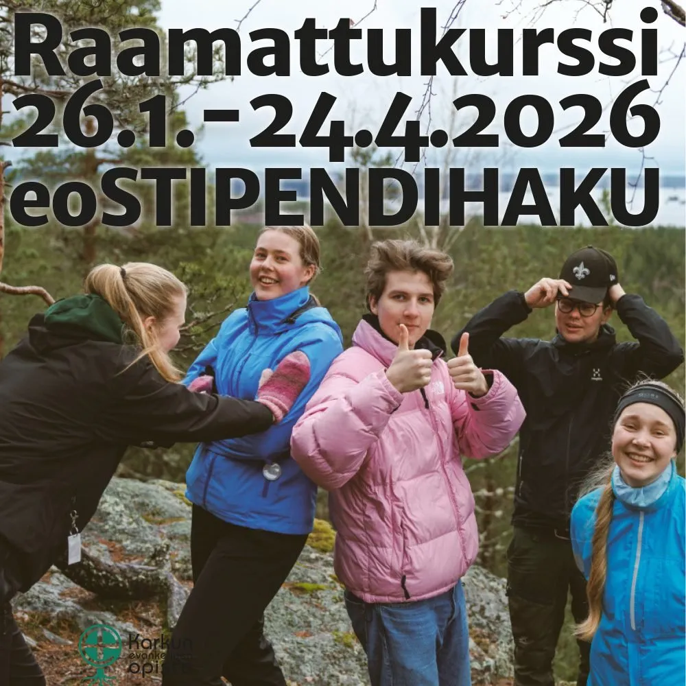Seuraava 3 kk raamattukurssi järjestetään Karkun evankelisella opistolla 26.1.-24.4.2026. Raamattukurssin aikana voit osallistua myös kuntovalmennukseen sekä psykologiseen vahvuusvalmennukseen tai vaikka opiskella kasvatus- ja aikuiskasvatustiedettä.